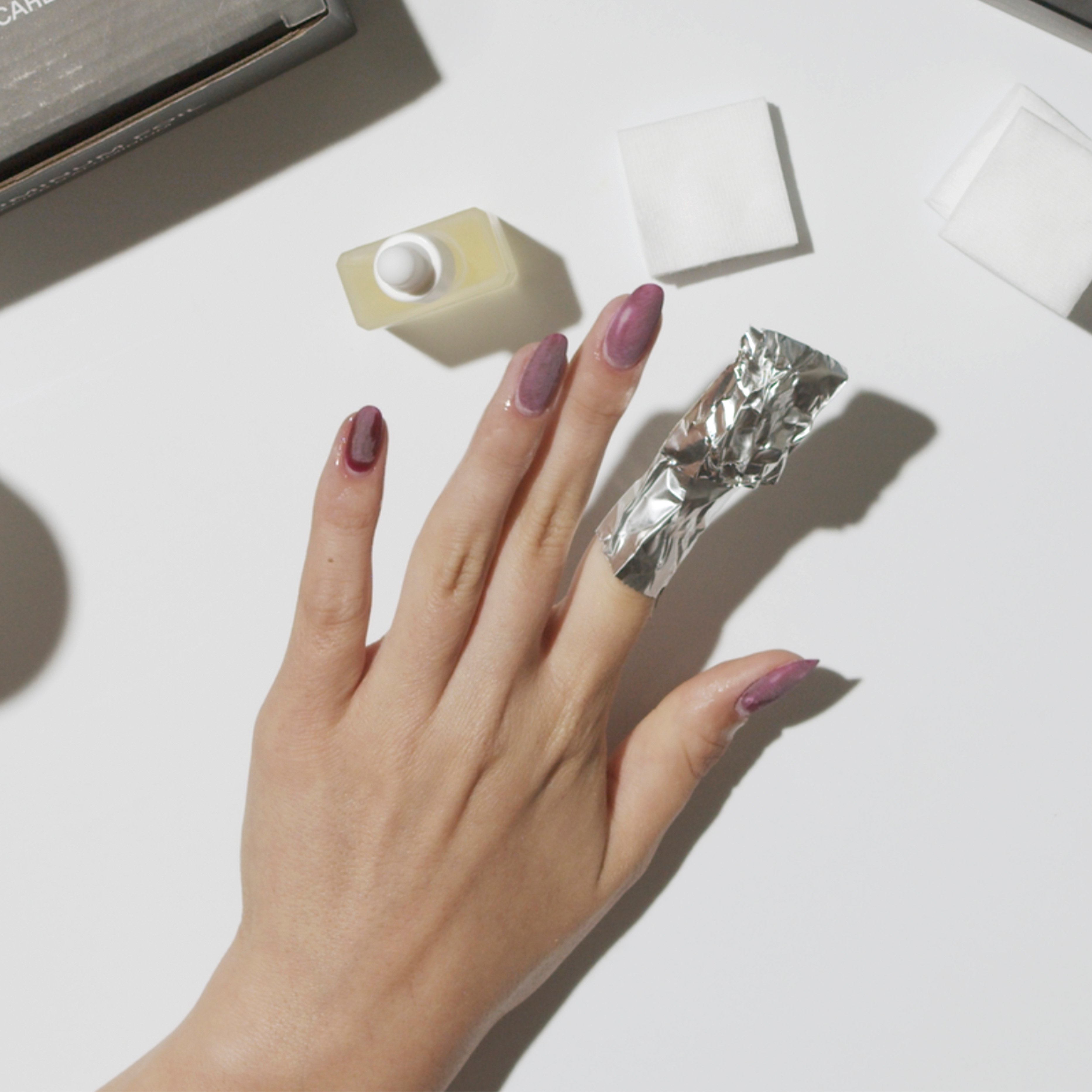 Wrap each nail with a Gel Removal Pad, soaked in Gel Removal Solution, and Aluminum Foil. Make sure that the Gel Removal Pad covers the entire nail plate and that the Aluminum Foil is secure around each finger.