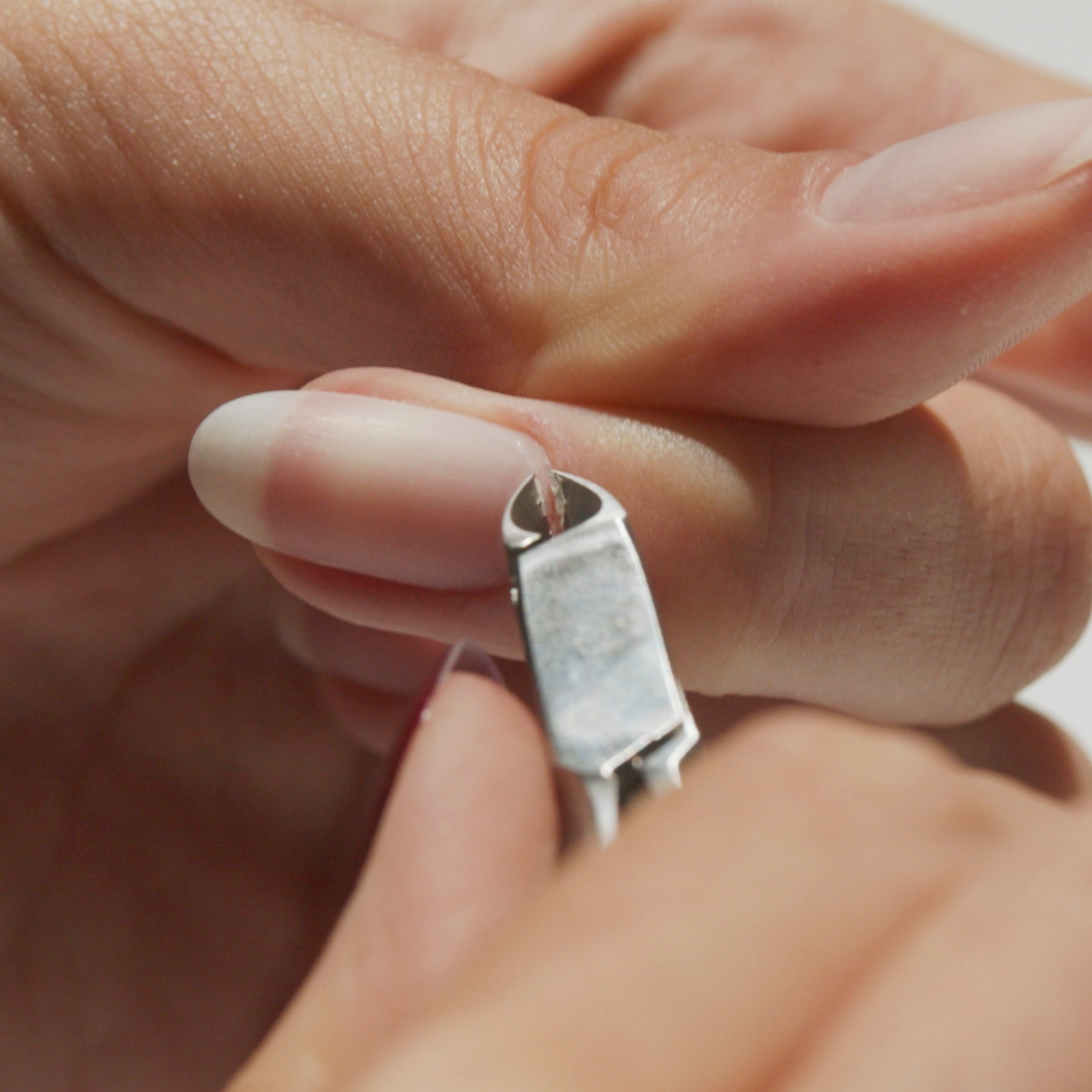 If necessary, trim off excess cuticles with the Cuticle Nipper. Make sure to always look between the blades so you know exactly where you are about to cut. For a clean trim, use the tip of the blades and gently cut the cuticle in one long piece. If cutting your cuticles scares you, skip this step!