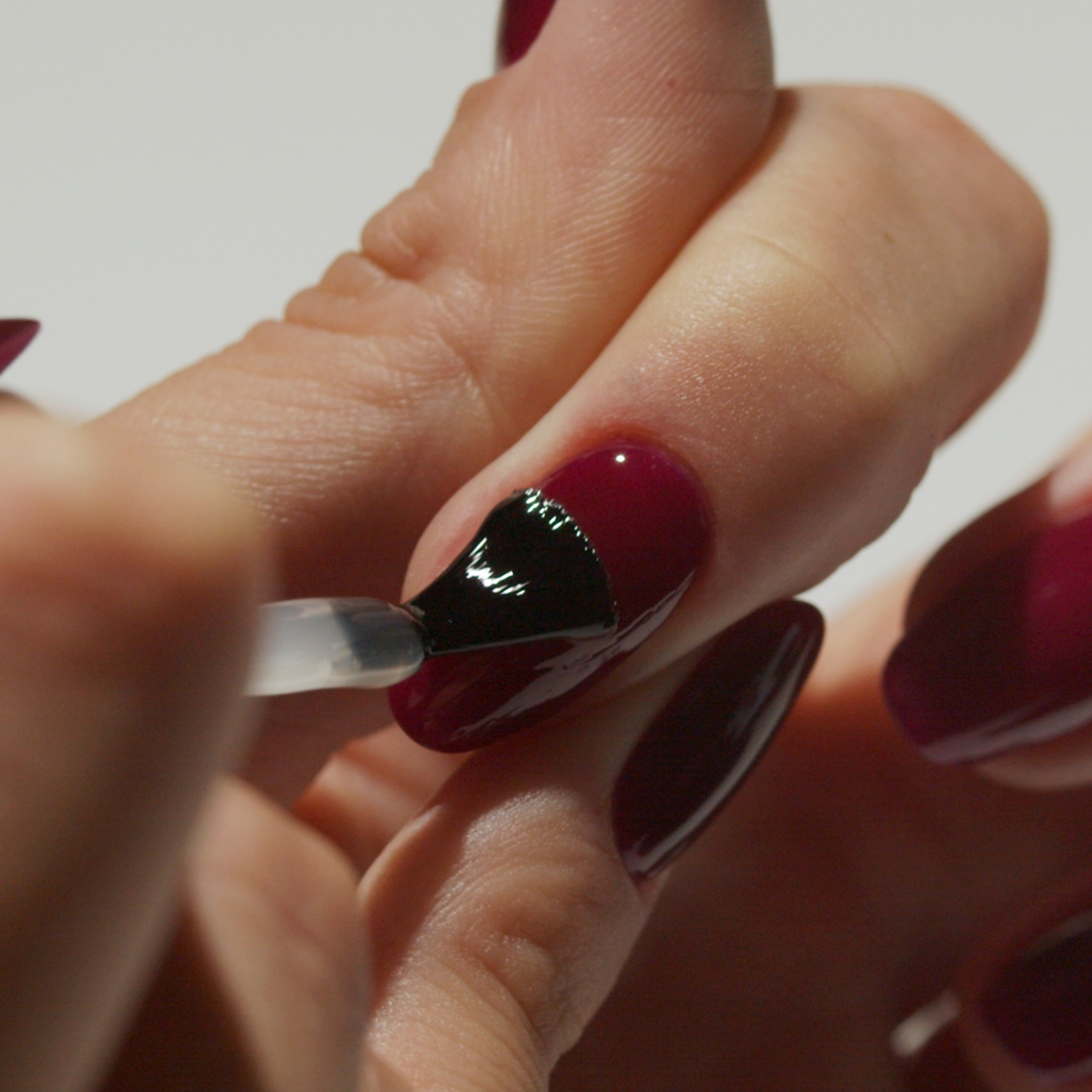 Make sure to work with only a small amount of gel on your brush for a flawless application. Use the sides of the bottleneck to wipe off any excess gel. Start by applying the colour to the centre of the nail. Slide the gel up towards the cuticles without touching them. With long and fluid strokes, glide the gel down the sides of the nail to the tip.